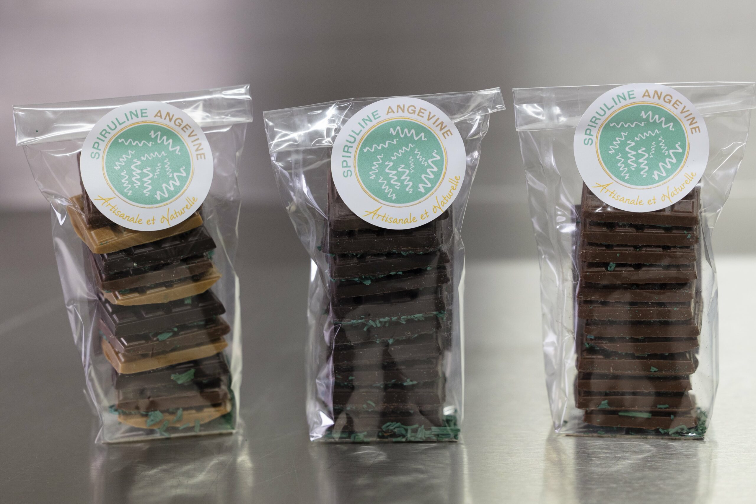 | Noir, Lait et Blond | Mini-tablettes en mélange de chocolat noir 72%, au lait 39%, et blond au goût biscuité. Tous sont pur beurre de cacao, avec 10% de spiruline en petites brindilles. Un sachet contient 11 à 13 bouchées, soit 80-85g de produit. Ce produit peut être indisponible entre mai et octobre. |